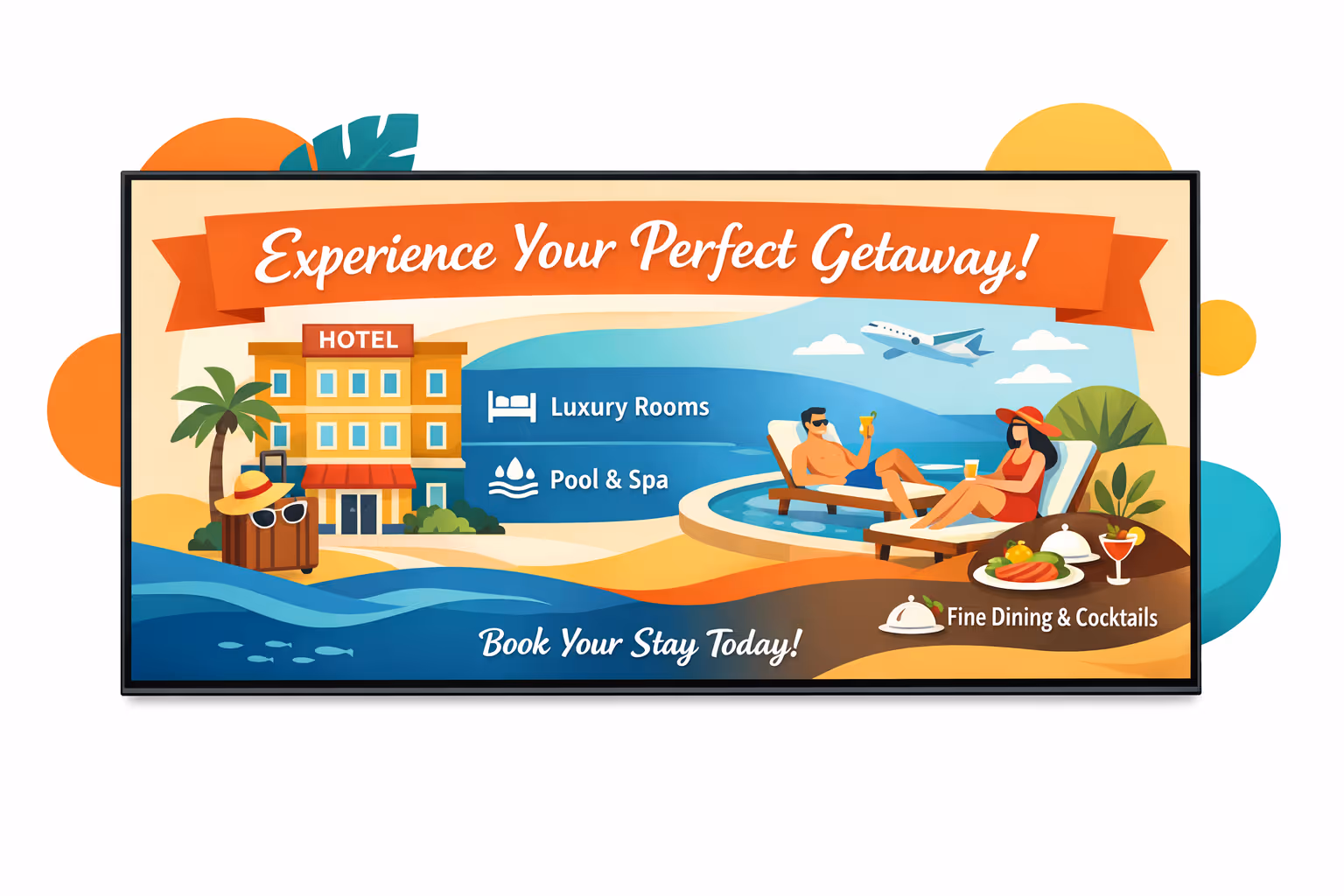 Great hospitality digital signage content is readable in a glance and useful in the moment. Guests are not standing still to read paragraphs. They are walking, waiting, or scanning for direction.