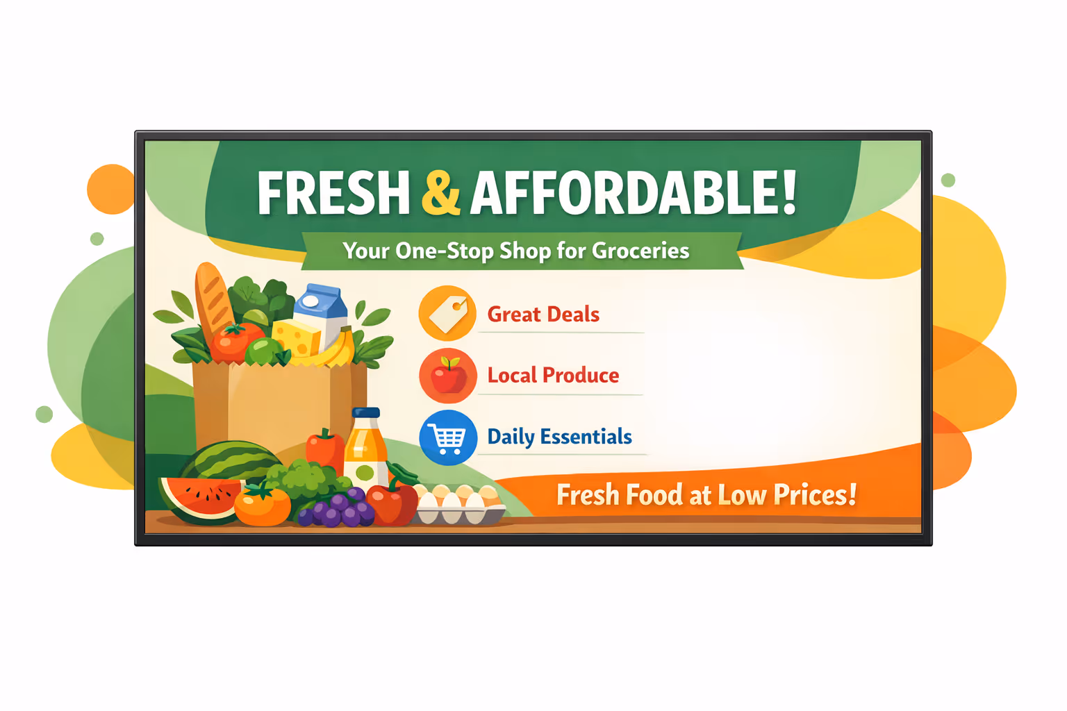 Grocery store digital signage means centrally managed screens that display dynamic content across grocery environments. Instead of printing, shipping, and replacing paper signage, you publish content to screens from one place and schedule it by store, department, time, or audience.