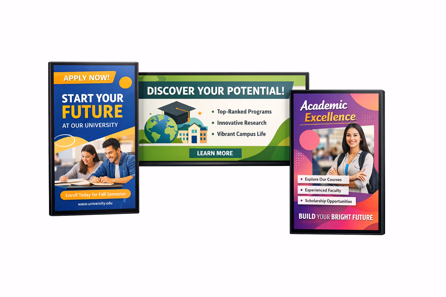People want to know where to go, what documents to bring, and what happens next. Without clear university digital signage, staff spend their time giving directions instead of supporting students with real needs.