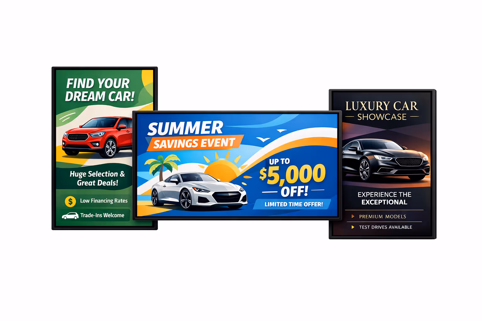 Posters become outdated fast, and in dealerships, outdated information costs money. Incentives change, service specials rotate, inventory moves, and compliance details matter. Digital signage lets you update quickly without printing, shipping, or hoping someone swaps a sign.
