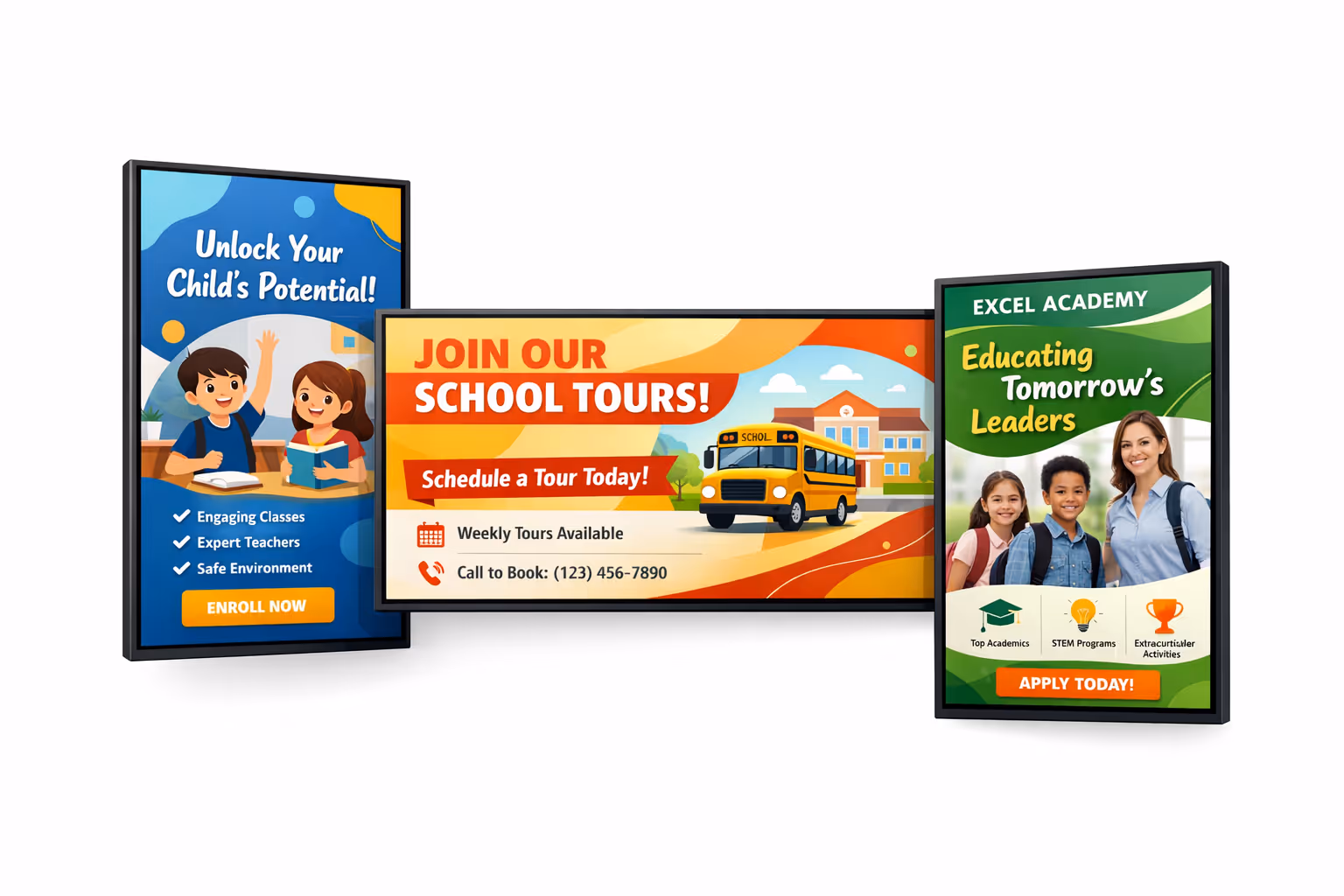 Administra carteles digitales escolares desde una plataforma segura. Crea, revisa, programa y publica anuncios, mensajes de seguridad y promociones de eventos en aulas, pasillos, cafeterías y campus con el control que necesita TI y la velocidad en la que confían marketing y operaciones.