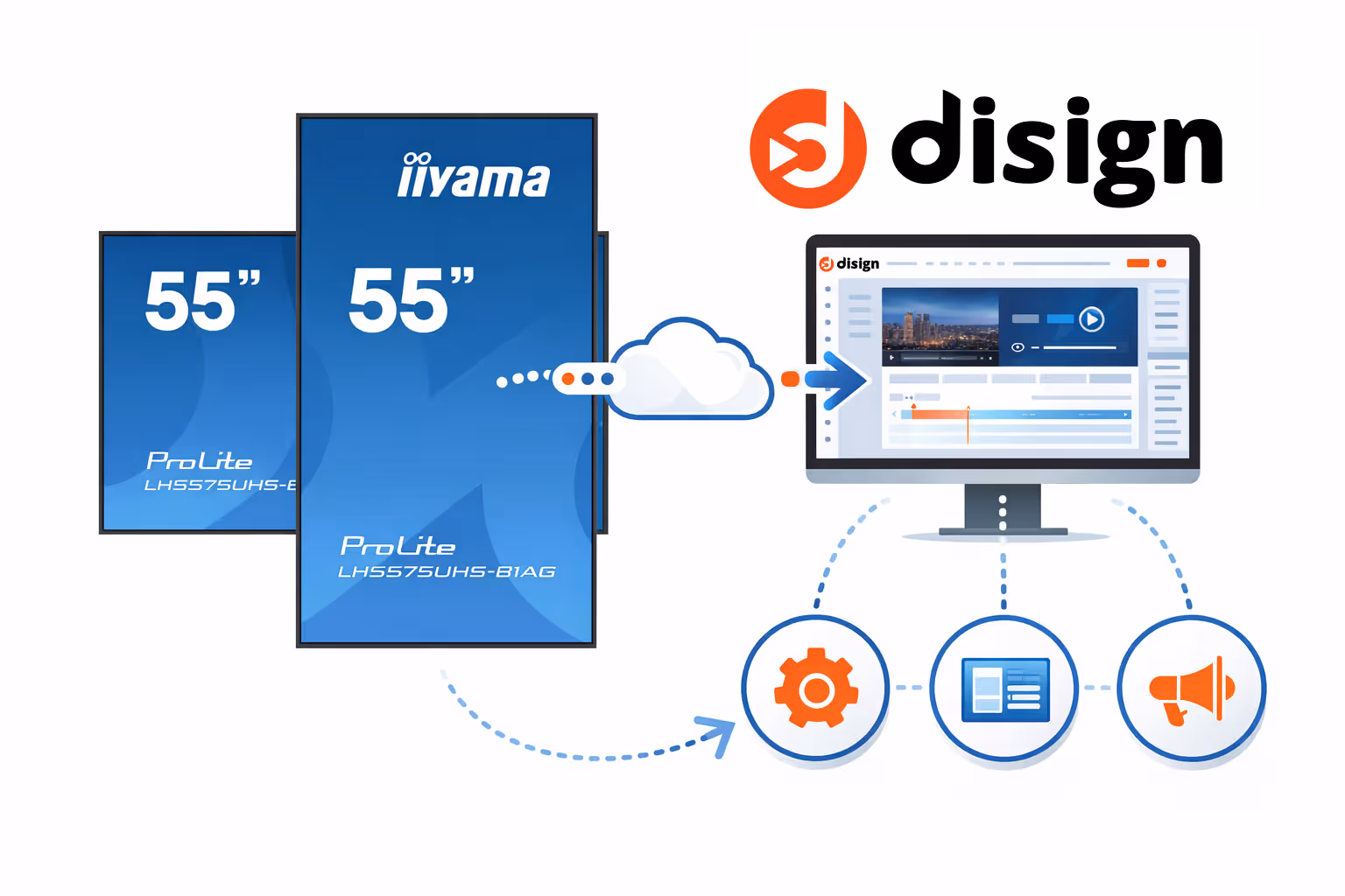 Obtén una configuración de señalización digital fiable y rentable con pantallas profesionales iiyama y Disign. Desde una sola pantalla hasta un despliegue multi-sitio, obtienes calidad de imagen profesional, una amplia elección de tamaños de pantalla y una gestión remota sencilla, respaldada por equipos que se conocen y se mantienen alineados.