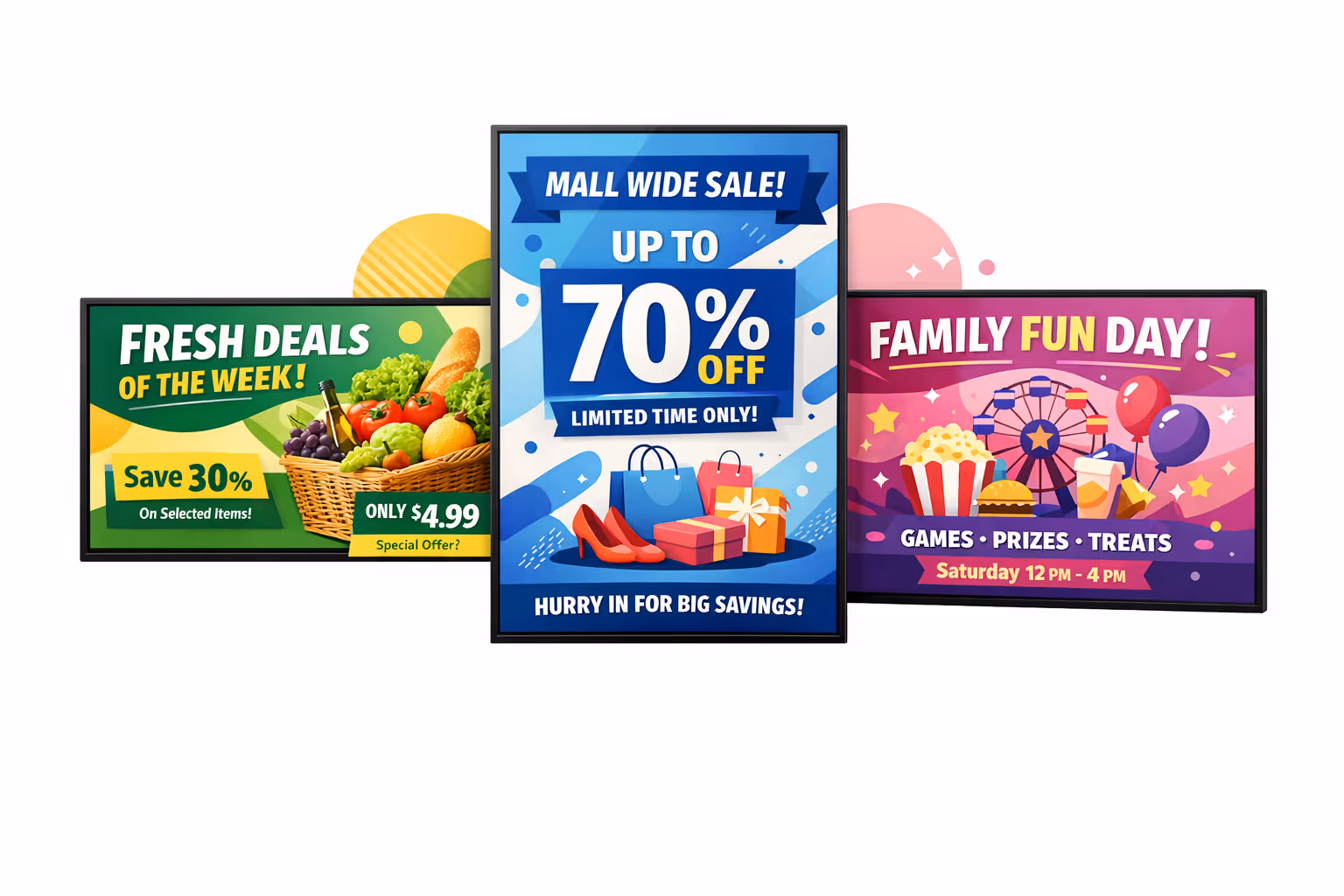 Screens influence decisions when shoppers are physically close to products or services. That is why supermarket and shopping mall digital signage can be effective for promoting higher margin items, driving trial, and encouraging impulse buys.