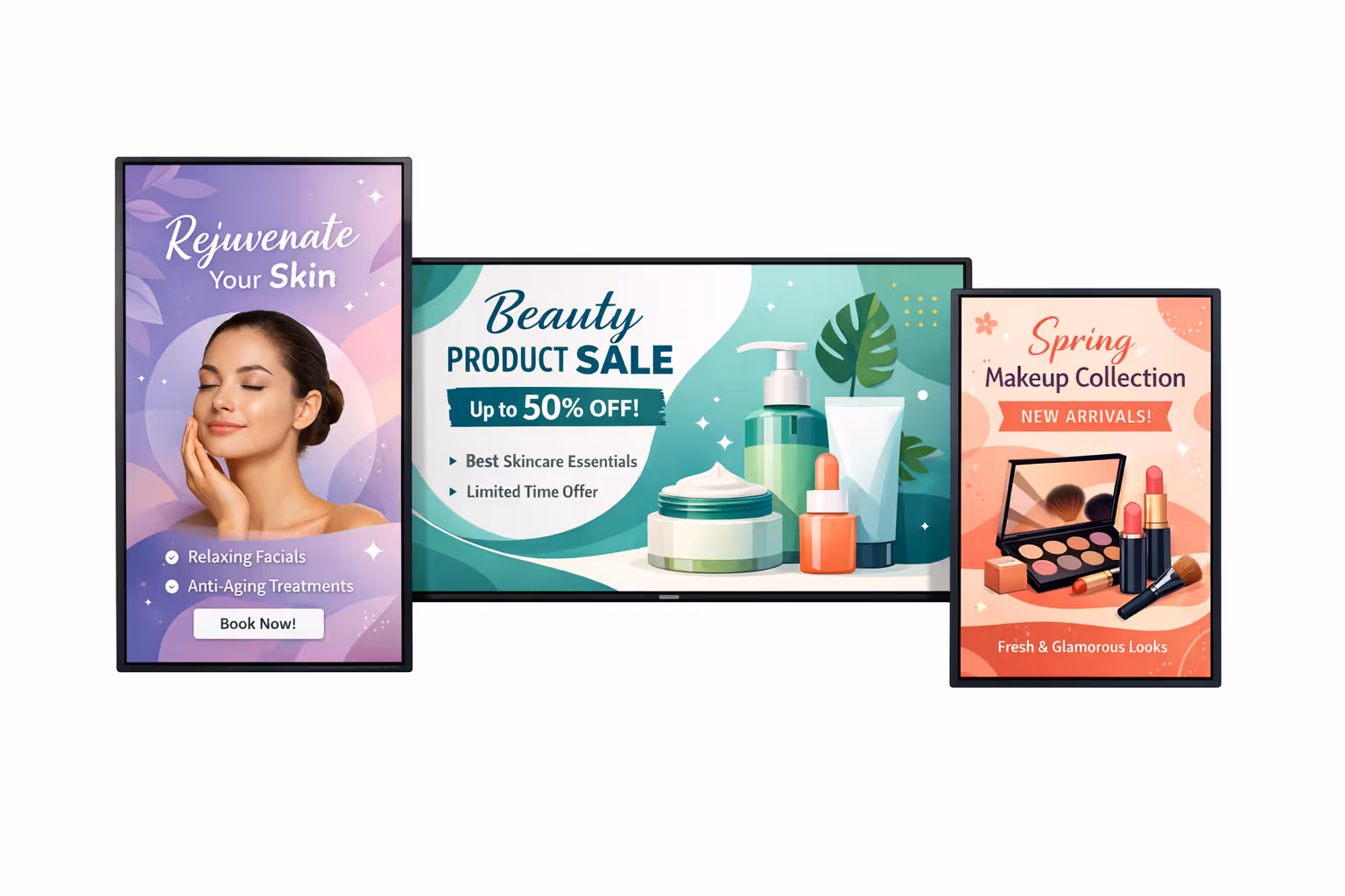 Lancia schermi curati per saloni, spa, beauty bar e cliniche con Disign. Promuovi servizi e prodotti, evidenzia offerte stagionali, guida i clienti e condividi visual del marchio in ogni posizione. Provalo gratis per 28 giorni, senza carta di credito richiesta.