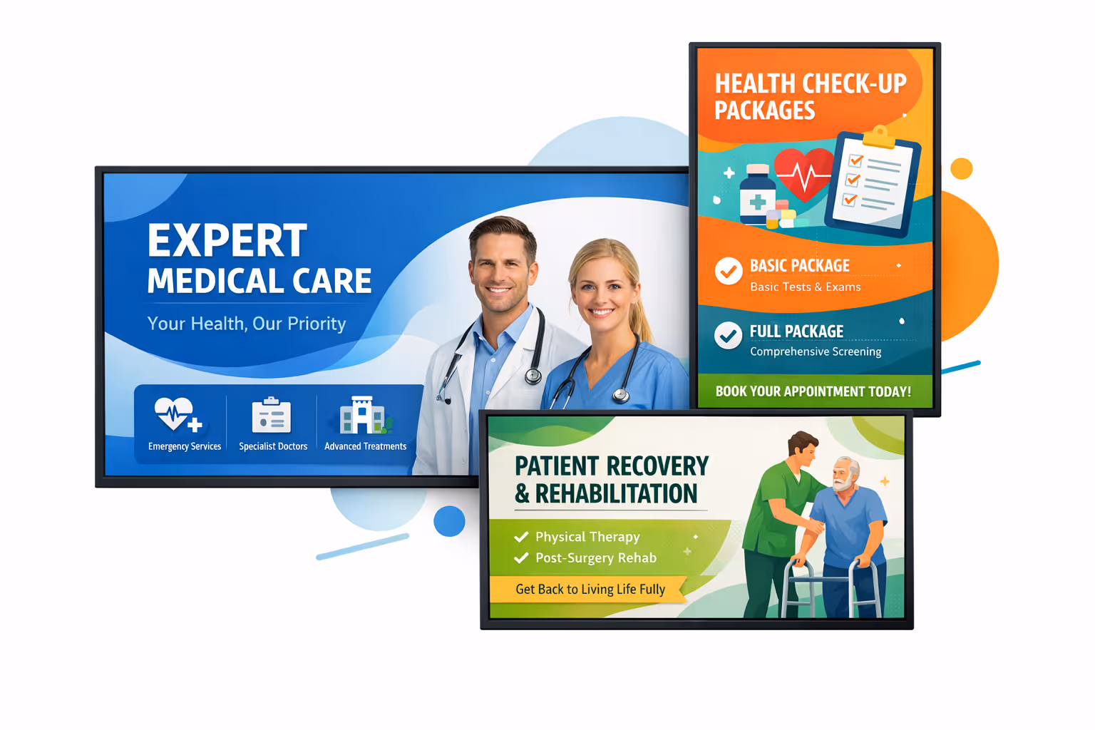 Gestisci il digital signage ospedaliero in sale d'attesa, corridoi, stazioni per infermieri e siti ambulatoriali da un'unica piattaforma sicura. Disign aiuta i team a pubblicare aggiornamenti in tempo reale, supporto alla navigazione, stato delle code e messaggi di sicurezza con accesso controllato e modifiche tracciabili.