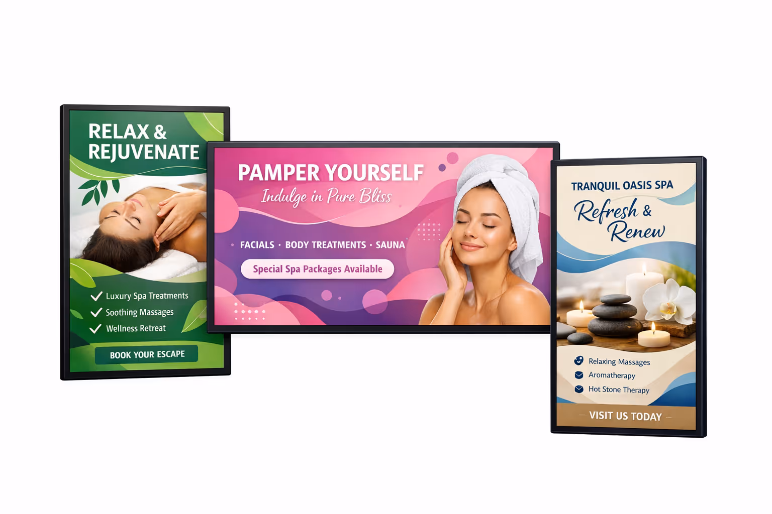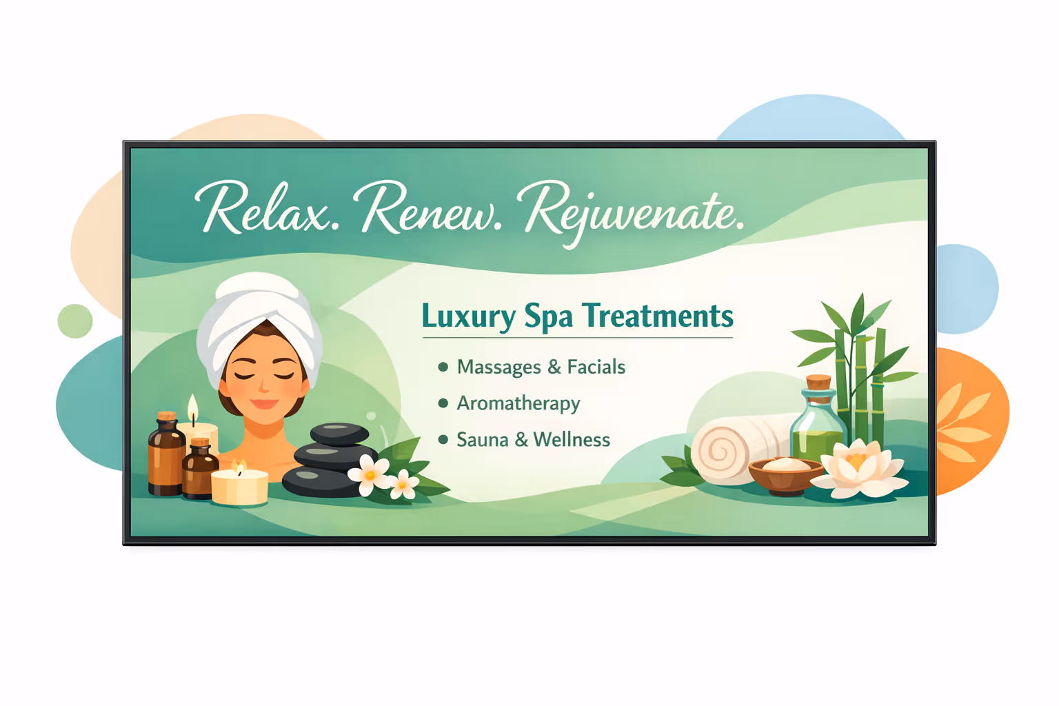 Spa digital signage should look like an extension of your brand. It should feel calm, clean, and intentional. The goal is readability without harsh contrast or busy visuals.